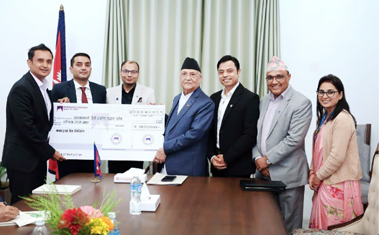 बैंकका अध्यक्ष रोशन केसीले सम्मानीय प्रधानमन्त्री केपी शर्मा ओलीलाई आइतबार २५ लाख रुपैयाँको चेक हस्तान्तरण गरेका हुन् ।