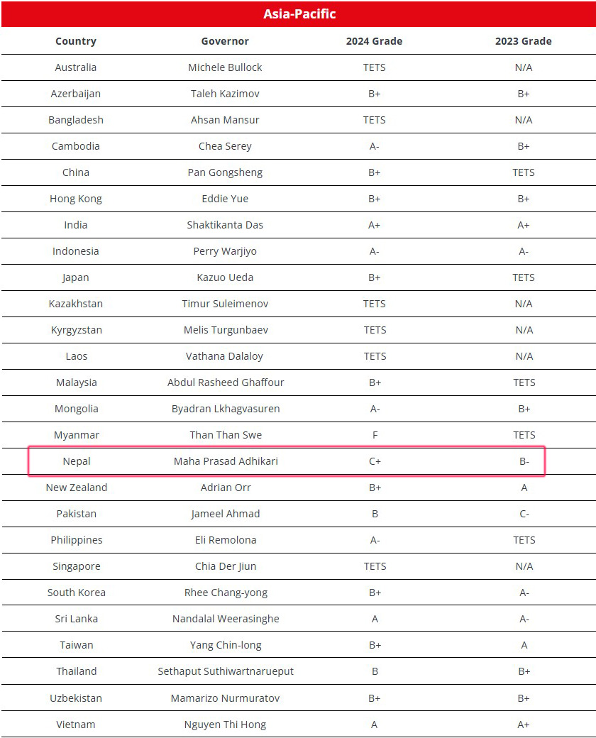 एसिया प्रशान्त क्षेत्रमा सबैभन्दा कमजोर ग्रेड पाउनेमा अधिकारी दोस्रोमा पर्छन् । म्यानमारका गभर्नरले अधिकारीको भन्दा कमजोर अर्थात् एफ रेटिङ पाएका छन् ।