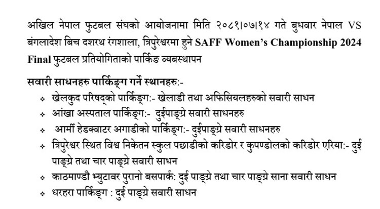 काठमाडौं । साफ च्याम्पियनसिप २०२४ को नेपाल र बंगलादेश बीच खेल हेर्न जाने दर्शकका लागि ६ स्थानमा पार्किङको व्यवस्था गरिएको छ ।