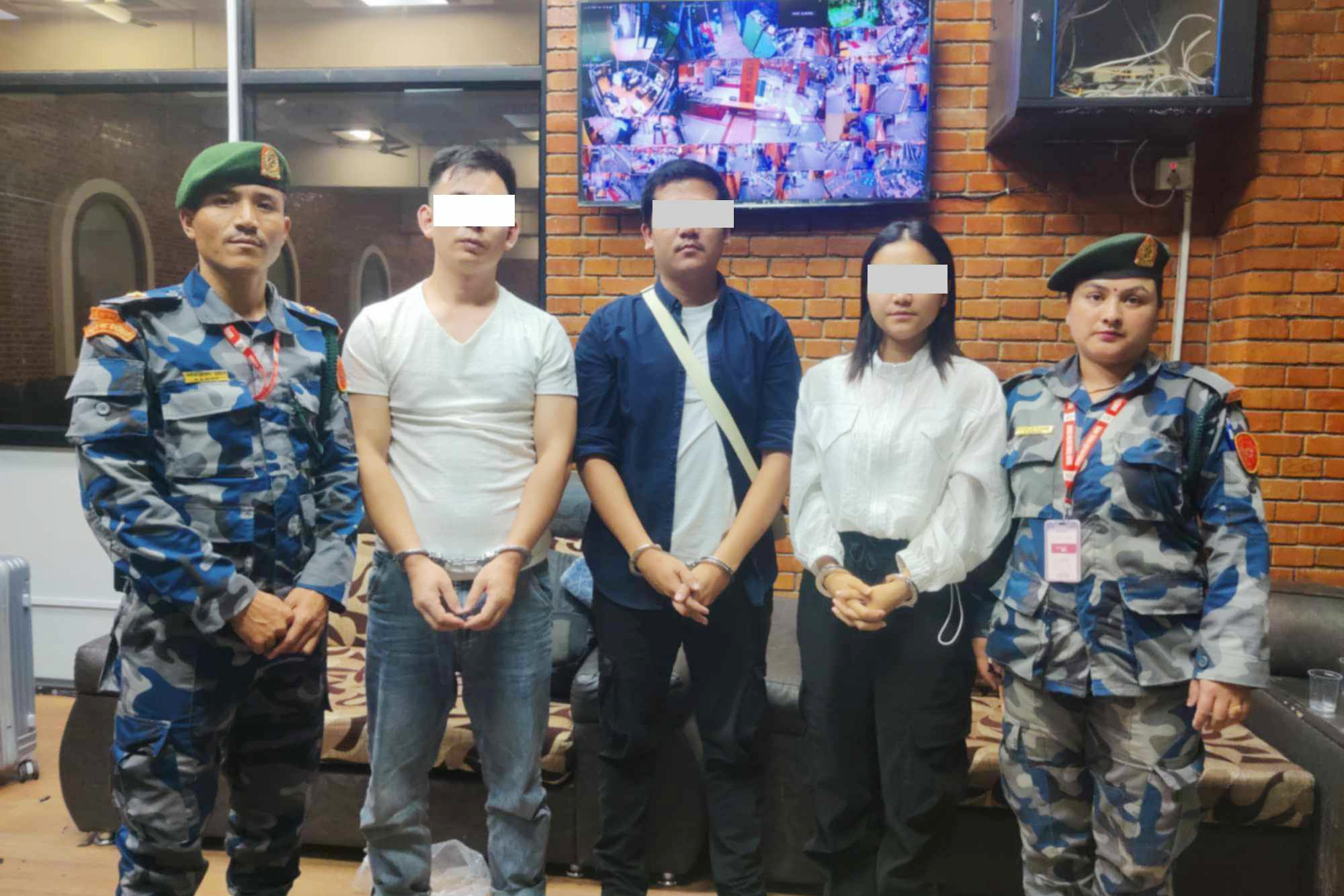 एयर अरेबियाको विमान चढेर शारजाहबाट काठमाडौं आएका एक जना चिनियाँ र दुई जना म्यान्माका नागरिकलाई मङ्गलबार साँझ पक्राउ गरिएको सशस्त्र प्रहरी बल नेपाल त्रिभुवन अन्तर्राष्ट्रिय विमानस्थल कार्यालयले जनाएको छ ।