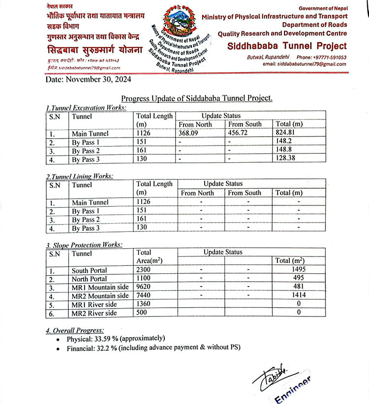 सिद्धबाबा सुरुङमार्ग आयोजनका अनुसार कुल ११२६ मिटर लामो मुख्य सुरुङ मार्गमध्ये हालसम्म ८२४.८१ मिटर खनिसकिएको हो । जसमा उत्तरतर्फ ३६८.०९ मिटर र दक्षिणतर्फ ४५६.७२ मिटर खनिसकिएको छ ।