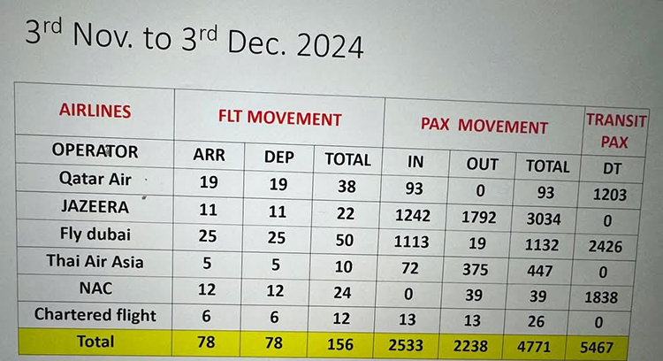 कात्तिक १८ गतेदेखि मंसिर १८ गते (३ नोभेम्ब-३ डिसेम्बर)सम्म उक्त विमानस्थलबाट ७८ अन्तर्राष्ट्रिय उडान र ७८ अवतरण भएको हो ।