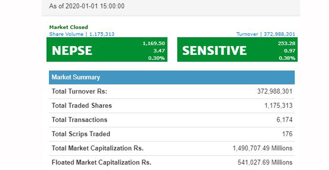 काठमाडौं । अंग्रेजी नयाँ वर्ष २०२० लाई सेयर बजारले स्वागत गरेको । आजबाटै शुरु भएको नेपाल भ्रमण वर्षको प्रभाव शेयर बजारमा पनि देखिएको छ । नेप्सेमा सूचीकृत होटल समूहकै सूचकमा पोजेटिभ सर्किट लागेको छ ।