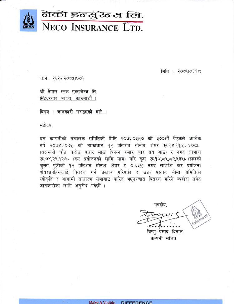 नेको इन्स्योरेन्सले लिमिटेडले १२ प्रतिशत बोनस सेयरको प्रस्ताव गरेको छ । इन्स्योरेन्सले गत आर्थिक बर्ष २०७४ ७५ को नाफाबाट बोनस सेयर दिने निर्णय गरेको हो ।