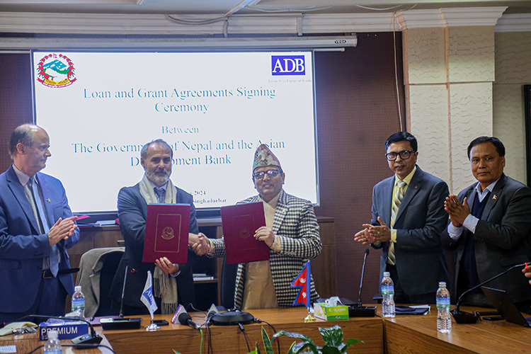 अर्थ मन्त्रालयमा आज आयोजित कार्यक्रममा ऋण एवं अनुदान सहायतासम्बन्धी सम्झौतापत्रमा अर्थसचिव डा. रामप्रसाद घिमिरे र एडीबीका देशीय निर्देशक आर्नो कोश्वाले हस्ताक्षर गरे ।