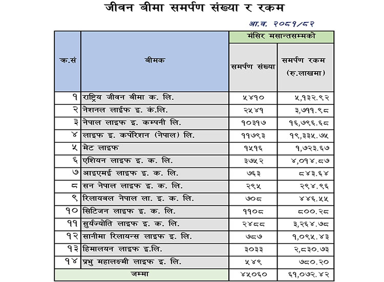 त्यसैगरी, आइएमई लाइफको ८ करोड ८३ लाख रुपैयाँको ७६३ वटा, सन नेपाल लाइफको २ करोड ९४ लाखको २९५ वटा, सिटिजन लाइफको ८ करोडको १ हजार १०८, सूर्यज्योति लाइफको ३२ करोड ६४ लाखको २ हजार ४८८ वटा, सानिमा लाइफको १० करोड ९५ लाखको ७८७ वटा, हिमालयन लाइफको २८ करोड ३० लाखको ३ हजार ३३ वटा र प्रभु महालक्ष्मी लाइफको ७ करोड ८० लाख रुपैयाँ बराबरको ५४९ वटा पोलिसी सरेन्डर गरेका छन् ।