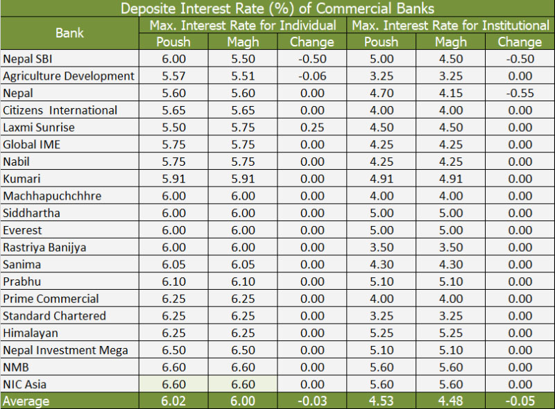पुसको तुलनामा माघमा वाणिज्य बैंकहरूको निक्षेपको ब्याजदर औसतमा व्यक्तिगततर्फ ०.०२ प्रतिशत बिन्दुले घटेको छ भने संस्थागततर्फ ०.०५ प्रतिशत बिन्दुले घटेको छ । पुसमा व्यक्तिगत मुद्दतीको औसत ब्याजदर ६.०२ प्रतिशत रहेकोमा माघमा घटेर ६ प्रतिशत बिन्दुमा आइपुगेको छ । त्यस्तै, संस्थागत मुद्दतीको औसत ब्याजदर पुसमा ४.५३ प्रतिशत रहेकोमा माघमा घटेर ४.४८ प्रतिशतमा झरेको छ ।
