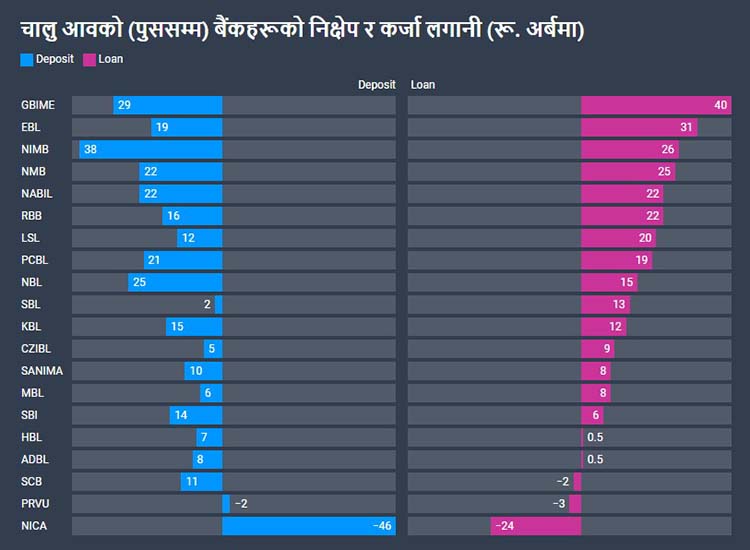 चालु आवको ६ महिनामा वाणिज्य बैंकहरूले मात्र २ खर्ब ३६ अर्ब रुपैयाँ निक्षेप र २ खर्ब ४९ अर्ब रुपैयाँ कर्जा लगानी गरेका छन् । यस अवधिमा १८ बैंकको निक्षेप र १७ बैंकले कर्जा लगानी बढाएका छन् भने २ बैंकको निक्षेप र ३ बैंकको कर्जा लगानी घटेको छ ।