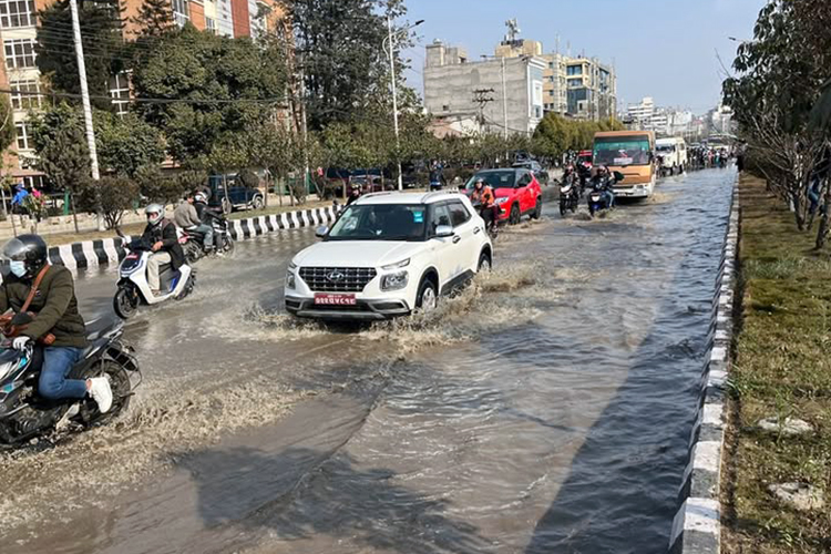 काठमाडौं । मेलम्ची खानेपानीको पाइप फुटेपछि काठमाडौंको बबरमहलको मुख्य सडक डुबानमा परेको छ । नयाँ बानेश्वरबाट माइतिघरतर्फ आउने सकडमा पाइप फुटेर सडकमा बाढी आएको हो ।