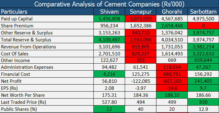 खुद नाफा : समीक्षा अवधिमा शिवम् र सवोत्तम सिमेन्ट मात्रै नाफामा छन् । घोराही र सोनापुर घाटामा छन् । पुससम्म सर्वोत्तमले सबैभन्दा धेरै २४ करोड १४ लाख रुपैयाँ र शिवम्ले ५ करोड ६८ लाख रुपैयाँ नाफा कमाएको छ । यस अवधिमा सर्वोत्तमको नाफा ६ गुणाले बढेको छ भने शिवम्को ६२ प्रतिशतले घटेको छ ।