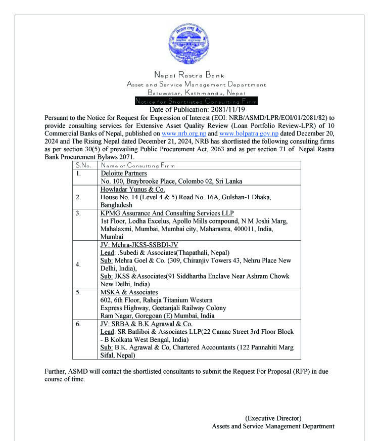 राष्ट्र बैंकका अनुसार श्रीलंकाको डेलोइट पाट्र्स, बंगालदेशको हाउल्याडर युनुस एण्ड कम्पनी, भारतको केपीएमजी, एमएसकेए एण्ड एसोसियट्स छनोट भएका छन् । त्यसैगरी, नेपाल र भारतको ज्वाइन्ट भेन्जर्स रहेको जीभी मेहेरा जेकेएसएस, एमएसकेए एण्ड एशोसियटस् र एसआरबीए एण्ड बीके अग्रवाल एण्ड कम्पनी सर्टलिस्ट गरिएको राष्ट्र बैंकले जनाएको छ ।