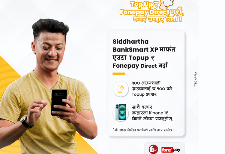 काठमाडौं । सिद्धार्थ बैंकले एफ वान सफ्ट र फोनपे सँगको सहकार्यमा टपअप/फोनपे डाइरेक्ट गरौं बम्पर उपहार जितौँ नामक अभियान सार्वजनिक गरेको छ ।