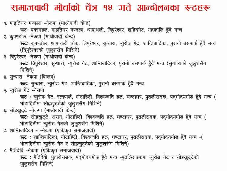 समाजवादी मोर्चाले चक्रपथ भित्रका विभिन्न ठाउँबाट जुलुस निकाल्ने छ । मोर्चाका अनुसार विभिन्न ८ वटा रुट हुँदै जुलुस भृकुटीमण्डपमा आउने छ । र, जनसभामा परिणत हुने मोर्चाले जनाएको छ । जनसभामा शीर्ष नेताहरूले सम्बोधन गर्ने कार्यक्रम छ ।