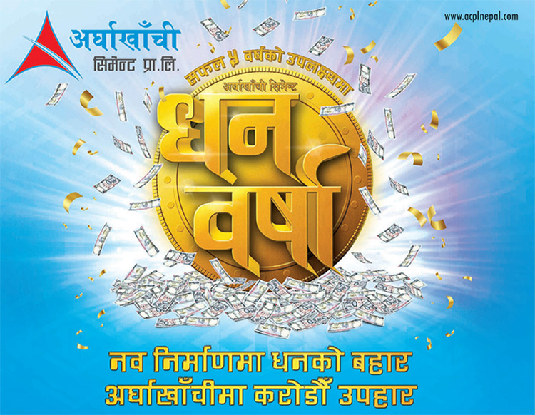 ‘नव निर्माणमा धनको बहार, अर्घाखाँचीमा करोडाैं उपहार’ नारा दिइएको यस योजना अर्घाखाँची सिमेन्टलले स्थापनाको पाँचाैं वर्षको उपलक्ष्यमा मंसिर ८ गतेदेखि माघ ८ सम्मका लागि ल्याएको थियो । समयावधी थप भएपनि अन्य शर्तहरुमा केही पनि परिबर्तन नभएको कम्पनीले जनाएको छ ।