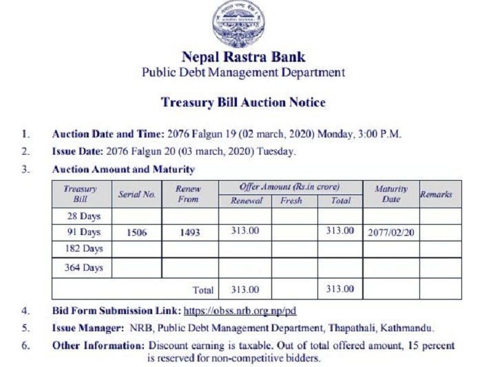 केन्द्रीय बैंकले मंसिर २० गते जारी गरेको ट्रेजरी बिल मंगलबार परिपक्व हुने भएपछि त्यसलाई नवीकरण गर्दै पुनः जारी गर्न लागेको हो ।