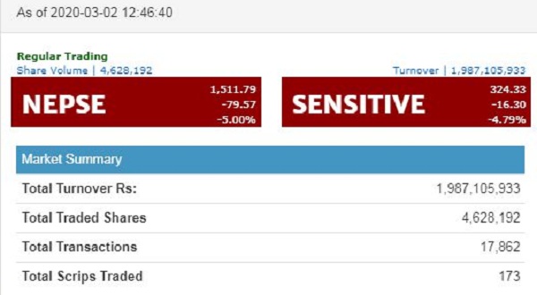 नेप्सेको नियम अनुसार कारोबारको पहिलो २ घण्टामा सूचक ५ प्रतिशतले घटेपछि ४० मिनेटका लागि कारोबार रोकिएको छ ।