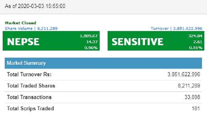 सेयर बजार मापक सूचक नेप्से आज १४.३७ अंकले बढेर १५०९.६७ विन्दुमा पगेको छ । यसदिन ३ अर्ब ८५ करोड १६ लाख २२ हजार ९९६ रुपैयाँ बराबरको कारोबार भएको छ । ८२ लाख ११ हजार २८९ कित्ता सेयर कारोबार भएको छ ।