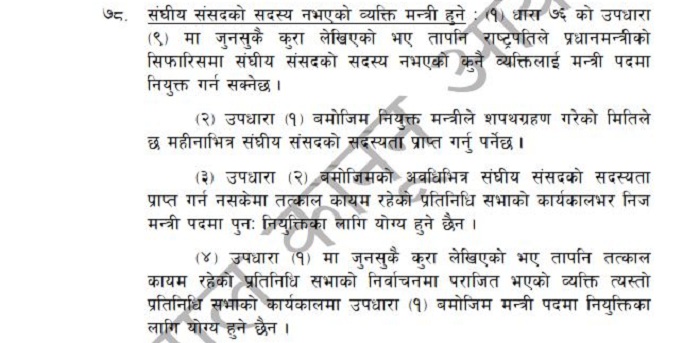 संविधानको धारा ७८ को उपधारा १ मा संघीय संसदको सदस्य नभएको व्यक्तिलाई राष्ट्रिपतिले प्रधानमन्त्रीको सिफारिसमा मन्त्री पदमा नियुक्त गर्न सक्ने प्रावधान छ । यस्तै सोही धाराको उपधारा २ मा त्यसरी नियुक्त भएको व्यक्ति शपथ ग्रहण गरेको मितिले ६ महिनाका लागि मन्त्री हुन पाउने व्यवस्था छ ।