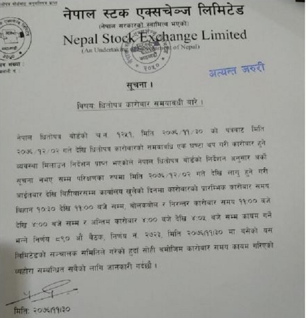 नेपाल धितोपत्र बोर्डले सेयर कारोबार समयाधवी थप गर्ने विषयमा अध्ययन गर्न केहि दिन अघि नेप्सेलाई निर्देशन दिएको थियो । बोर्डको निर्देशन अनुसार शुक्रबार बसेको नेप्से सञ्चालक समिति बैठकले कारोबार समयावधि थप गरेको हो ।