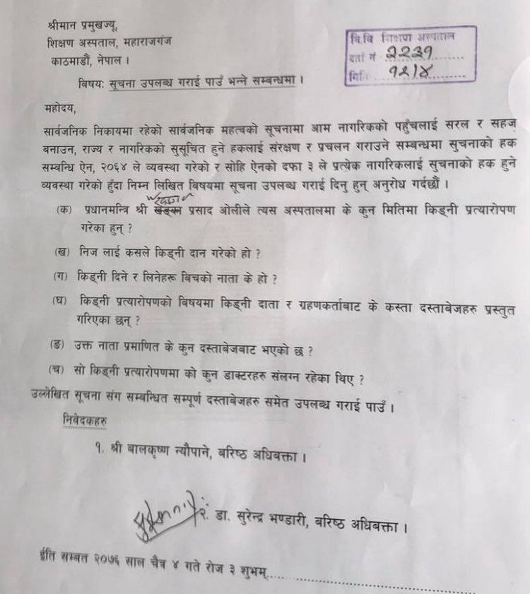 वरिष्ठ अधिवक्ताद्धय बालकृष्ण न्यौपाने र डा. सुरेन्द्र भण्डारीले मंगलबार त्रिवि शिक्षण अस्पताल, महाराजगञ्ज समक्ष प्रधानमन्त्रीको मिर्गौला प्रत्यारोपण बारे विस्तृत जानकारी गराउन सूचना माग गरेका हुन् ।
