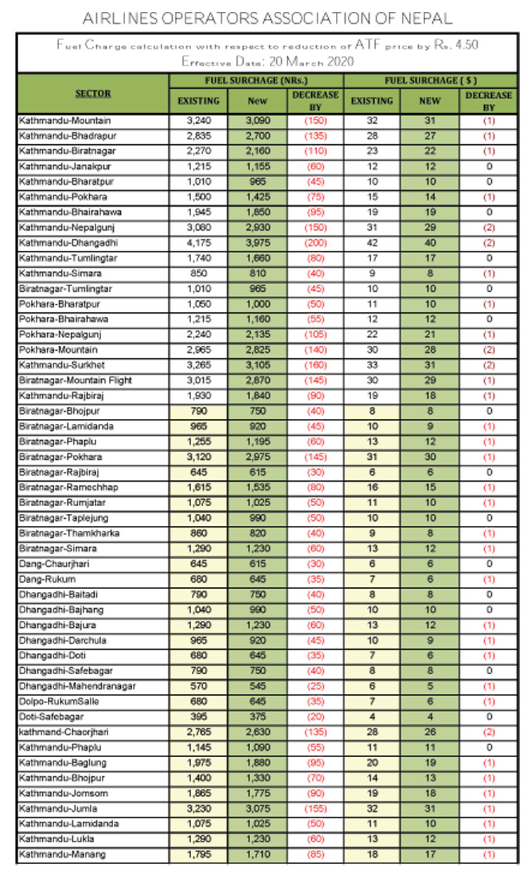 निगमले चैत ४ गते राती १२ बजेबाट लागुहुनेगरि हवाई इन्धनमा प्रतिलिटर ४ रुपैयाँ ५० पैसा मूल्य घटाएकाले हवाई भाडा घटाइएको वायुसेवा संचालक संघ, नेपालले जनाएको छ ।