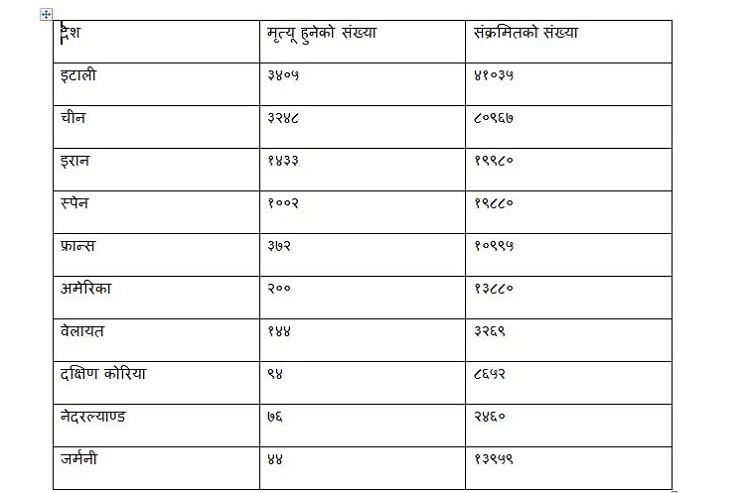 कोरोनाको कारण हालसम्म १० हजारभन्दा बढी मानिसले ज्यान गुमाइसकेका छन् । त्यसमा अहिलेसम्म सबैभन्दा धेरै इटलीमा ३४०५ जना मानिसको मृत्यू भएको छ भने ४१ हजार ३५ जना संक्रमित रहेका छन् ।