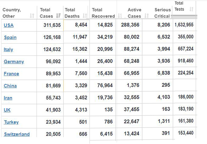 कोरोनाले सबैभन्दा बढी प्रभावित भएको छ अमेरिका । अमेरिकामा हालसम्म ३ लाख १२ हजार संक्रमित भइसकेका छन् । यो विश्वका कुल संक्रमितको २६ प्रतिशतभन्दा बढी हो । अहिलेसम्म साढे ८ हजारको मृत्यु भइसकेको छ । अमेरिकामा पछिल्ला दिनमा कोरोनाको संक्रमण दर तीव्र गतिमा बढेको छ । नयाँ संक्रमितको संख्या औसतमा दैनि ३० हजारभन्दा बढी छ ।