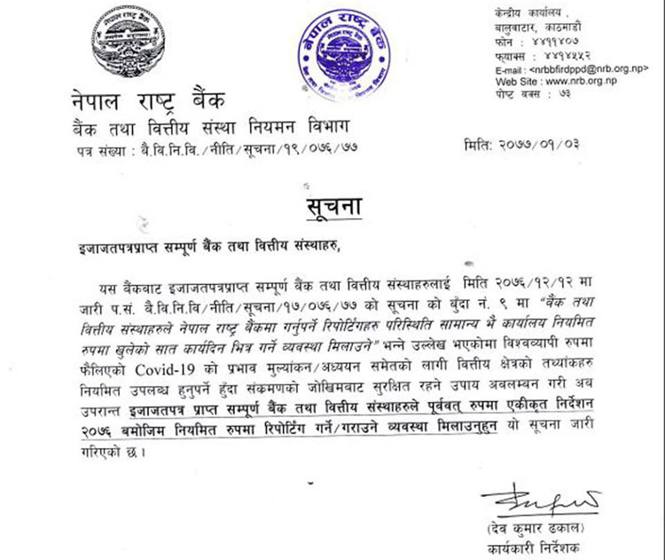 यसअघि गत चैत १२ गते राष्ट्र बैंकले नियमित हुने रिपोर्टिङ अवस्था सामान्य भइ कार्यालय नियमित रुपमा खुलेको सात दिनभित्र रिपोर्टिङ गर्न भनेको थियो। यसले बैंकिङ क्षेत्रमा के कस्तो भइरहेको छ भन्ने थाहा नै नहुने अवस्था आएपछि पहिलेजस्तै नियमित रिपोर्टिङ गर्न निर्देशन दिएको राष्ट्र बैंकले जनाएको छ।