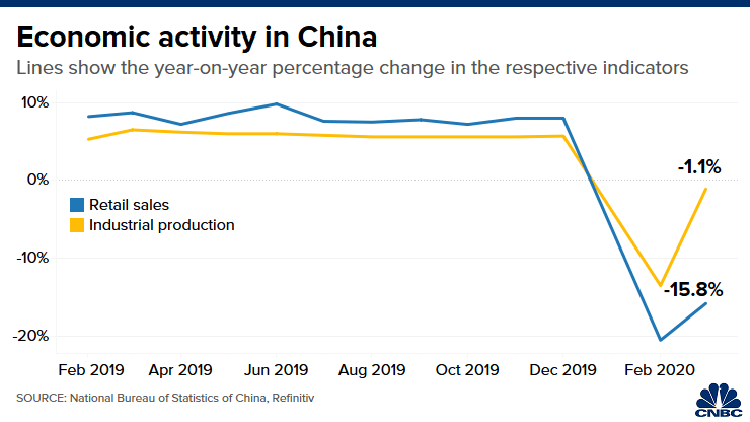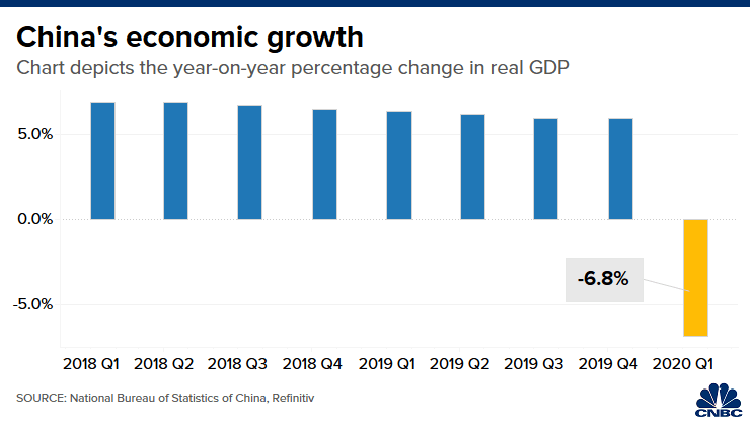 चीनको राष्ट्रिय तथ्यांक विभागका अनुसार सन् २०२० को प्रथम त्रैमासिकले गिरावटको नतिजा दिएको छ। शुक्रबार सार्वजनिक तथ्यांक अनुसार सन् २०२० को पहिलो त्रैमासिकमा चीनको अर्थतन्त्रमा ६.८ प्रतिशत गिरावट आएको हो । हाल चीनको अर्थतन्त्र १४ ट्रिलियन डलरको अर्थतन्त्र रहेको छ ।