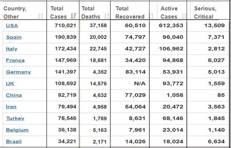 कोरोनाबाट सबैभन्दा क्षति अमेरिकाले व्यहोरेको छ । शनिबार बिहानसम्म अमेरिकामा ३७ हजार १५८ जनाको मृत्यु भइसकेको छ भने संक्रमित हुनेको संख्या ७ लाख १० नाघेको छ । यो विश्वकै कुल संक्रमितको ३१ प्रतिशत हो ।