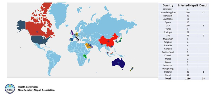 एनआरएनका अध्यक्ष कुमार पन्तको अध्यक्षतामा गठित कोभिड –१९ उच्चस्तरीय समिति, स्वास्थ्य उपसमितिले संकलन गरेको तथ्यांकानुसार बेलायतमा १७, अमेरिकामा ८, संयुक्त अरब इमिरेट्समा २ र आयरल्याण्डमा १ जनाको निधन भएको हो ।