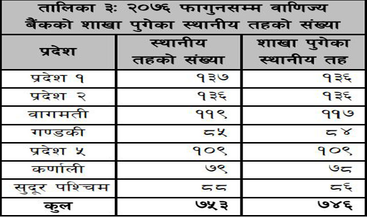 राष्ट्र बैंकको अनुसार बागमती र सुदूरपश्चिम प्रदेका २/२ स्थानीय तहमा वाणिज्य बैंक पुग्न सकेका छैनन् । बागमती प्रदेशमा जम्मा ११९ वटामध्ये ११७ र सुदूरपश्मिको ८८ मध्ये ८६ स्थानीय निकायमा बैंकका शाखा पुगेका छन् ।