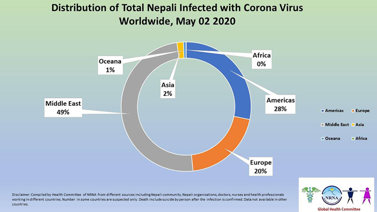 विश्वभर छरिएका गैरआवासीय नेपाली विज्ञ चिकित्सकको समूहले तयार पारेको सो आँकडा नुसार २७ देशमा रहेका नेपाली कोरोना भाइरसबाट संक्रमित छन् ।