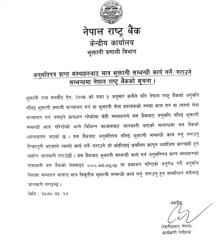त्यस्तै राष्ट्र बैंकले अनुमति प्राप्त संस्थाहरुबाट मात्र भुक्तानी कार्य गराउन सबैलाई आग्रह गरेको छ।