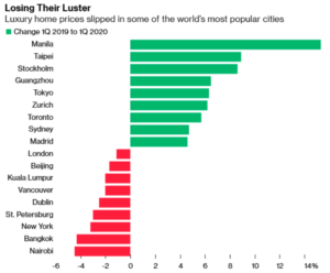 सन् २०१९ को पहिलो त्रैमासमा भन्दा यो वर्षको पहिलो त्रैमासमा न्यु योर्क, लण्डन, भ्यानकोभर, सिङ्गापुर, हङकङ जस्ता सहरहरुका विलासी घरहरुको मूल्यमा गिरावट आएको हो ।