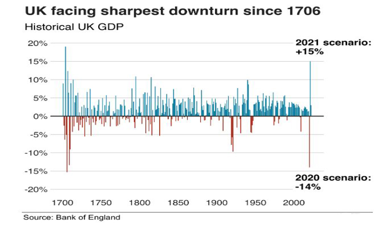 बैंक अफ इंगल्याण्डका अनुसार यस वर्ष वेलायती अर्थतन्त्रमा आउने गिरावट ३०० वर्ष यताकै सबैभन्दा ठूलो हुनेछ । सन् २०२० को लागि बीओईले गरेको प्रक्षेपण अनुसार यो आर्थिक गिरावट बेलायतको लागि सन् १७०६ यताकै ठूलो हो ।