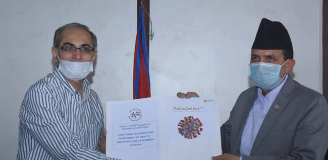 नेपालका लागि भारतका राजदूत विनयमोहन क्वात्राले स्वास्थ्य तथा जनसङ्ख्या मन्त्री भानुभक्त ढकाललाई ती किट आज स्वास्थ्य मन्त्रालयमा हस्तान्तरण गरे ।
