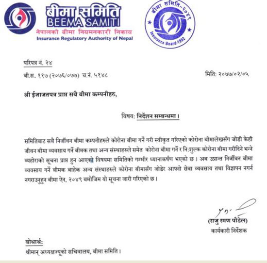समितिको निर्देशनसँगै अब जीवन बीमा कम्पनीहरुले कोरोना बीमा तथा सोसँग सम्बन्धित विज्ञापन गर्न पाउने छैनन्।