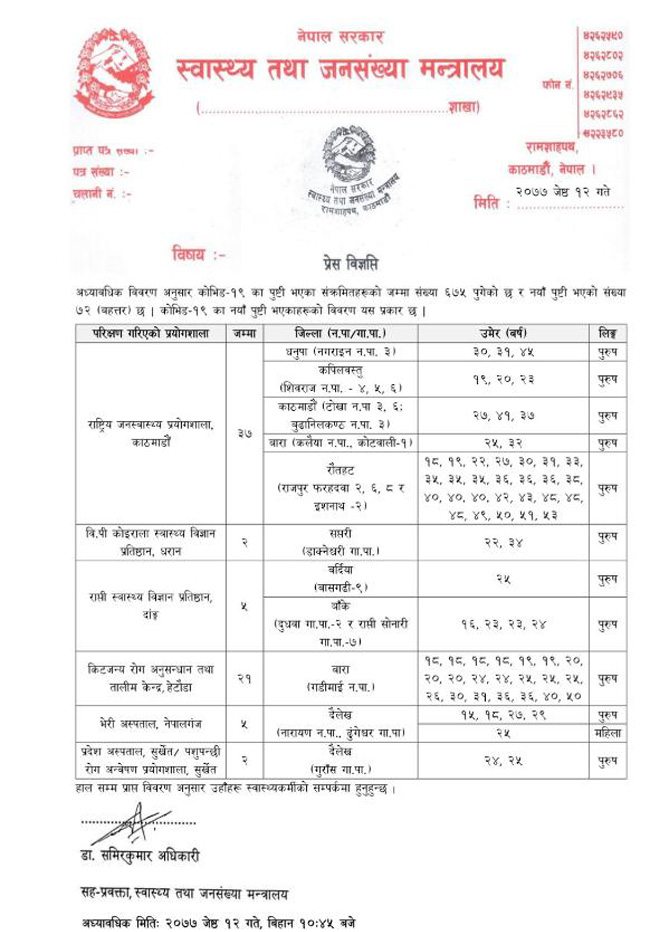 स्वास्थ्य तथा जनसंख्या मन्त्रालयका अनुसार काठमाडौंसहित देशका विभिन्न जिल्लाका ७२ जनामा कोरोना संक्रमण देखिएको हो ।