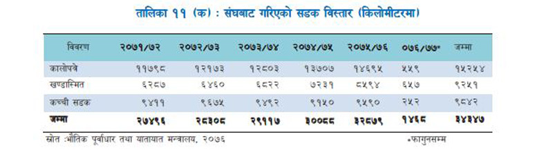 अर्थ मन्त्रालयले सार्वजनिक गरेको आर्थिक सर्वेक्षणअनुसार गत फागुनसम्ममा देशभरमा कालोपत्र सडक १५ हजार २५४ किमी, खण्डस्मिथ ९ हजार २५१ किमी र कच्ची सडक नौ हजार ८४२ किमी निर्माण भएको छ ।