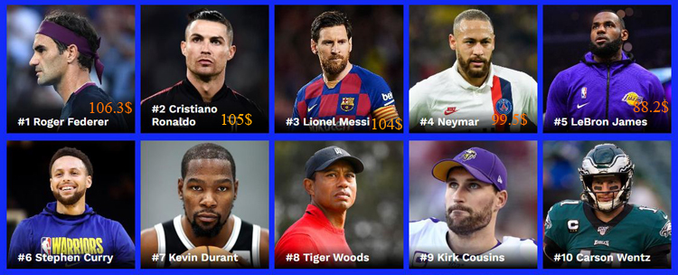 यस्तै अमेरिकी बास्केटबल खेलाडी स्टेफन केरी ७४.४ मिलियन, बास्केटबल खेलाडी केभिन डुरान्ट ६३.९ मिलियन, गल्फ खेलाडी टाइगर वुड्स ६२.३ मिलियन, फुटबलर क्रिक काउन्सिस् ६०.५ मिलियन र फुटबलर जारेड गोफ ४९ मिलियन डलर कमाउँदै क्रमशः शीर्ष दश भित्र रहेका छन् ।