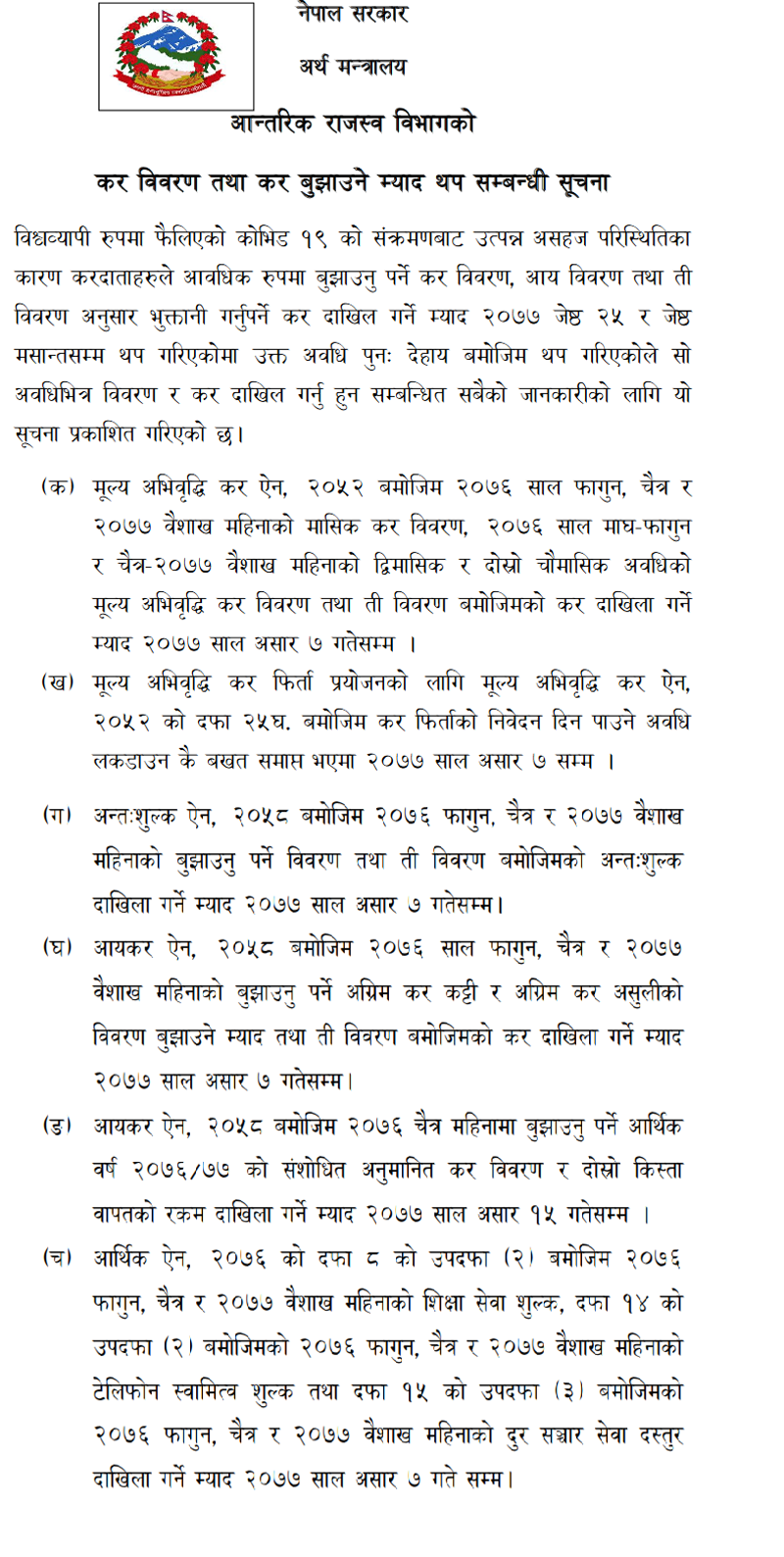 नयाँ सूचना अनुसार मूल्य अभिवृद्धि कर करतर्फ फागुन, चैत र वैशाखको मासिक, माघ र फागुन तथा चैत र वैशाखको द्धैमासिक र दास्रो चौमासिक चौमासिक कर विवरण तथा त्यसअनुसारको कर दाखिला गर्ने अन्तिम म्याद असार ७ कायम गरिएको छ ।
