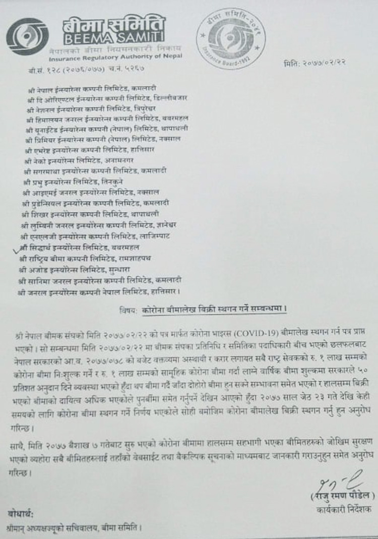 बिहीबार बीमा समिति र नेपाल बीमक संघबीच भएको छलफल पछि हालको लागि कोरोना बीमा रोक्न समितिले निर्देशन दिएको हो ।