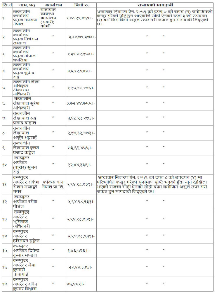 उनीहरुलाई न्यूनतम ४५ हजारदेखि अधिकतम ५ करोड ९५ लाख गरी करिब ४२ करोड रुपैयाँ बराबरको बिगो दाबी गरिएको छ ।