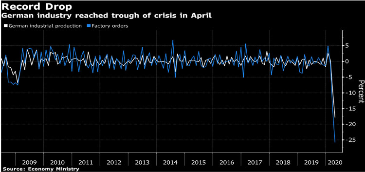 जर्मनीको औद्योगिक उत्पादन गत अप्रिल महिनामा १७.९ प्रतिशतले घटेको छ । युरोपकै सबैभन्दा ठूलो अर्थतन्त्र रहेको जर्मनीमा कोरोनाभाइरसको महामारीका कारण लकडाउन गरिएपछि औद्योगिक उत्पादनमा व्यापक ह्रास आएको सरकारी तथ्यांकमा उल्लेख छ ।
