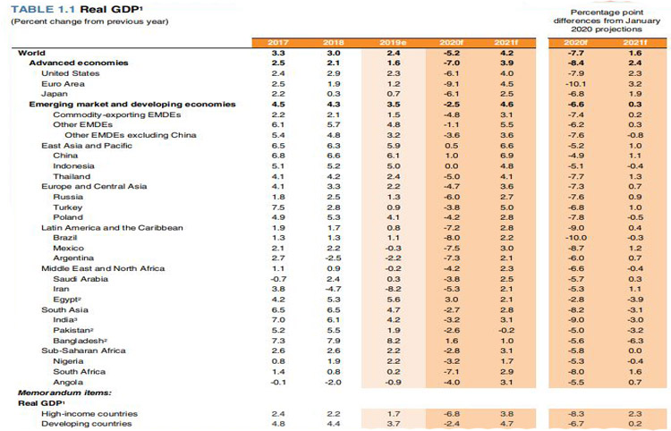 विश्व बैंकले सार्वजनिक गरेको प्रतिवेदन अनुसारविकसित देशहरुको अर्थव्यवस्थामा ७ प्रतिशतले गिरावट आउने तथा विकासशील देशहरुको अर्थतन्त्रमा २.५ प्रतिशत गिरावट आउन सक्ने अनुमान गरिएको छ । यो जुन सन् १९६० यताकै सबैभन्दा खराब तथ्यांक हो।