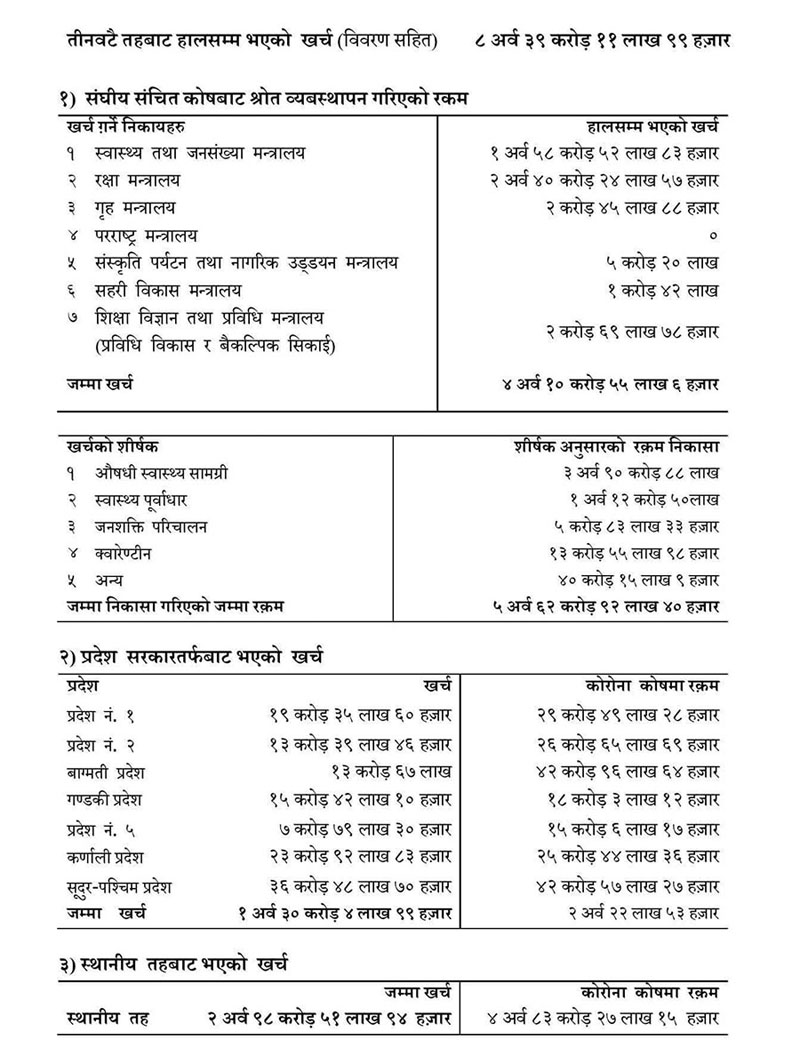 त्यसैगरी, प्रदेश सरकारमार्फत १ अर्ब ३० करोड ४ लाख ९९ हजार र स्थानीय सरकारमार्फत २ अर्ब ९८ करोड ५१ लाख ९४ हजार रुपैयाँ खर्च भएको जनाइएको छ ।