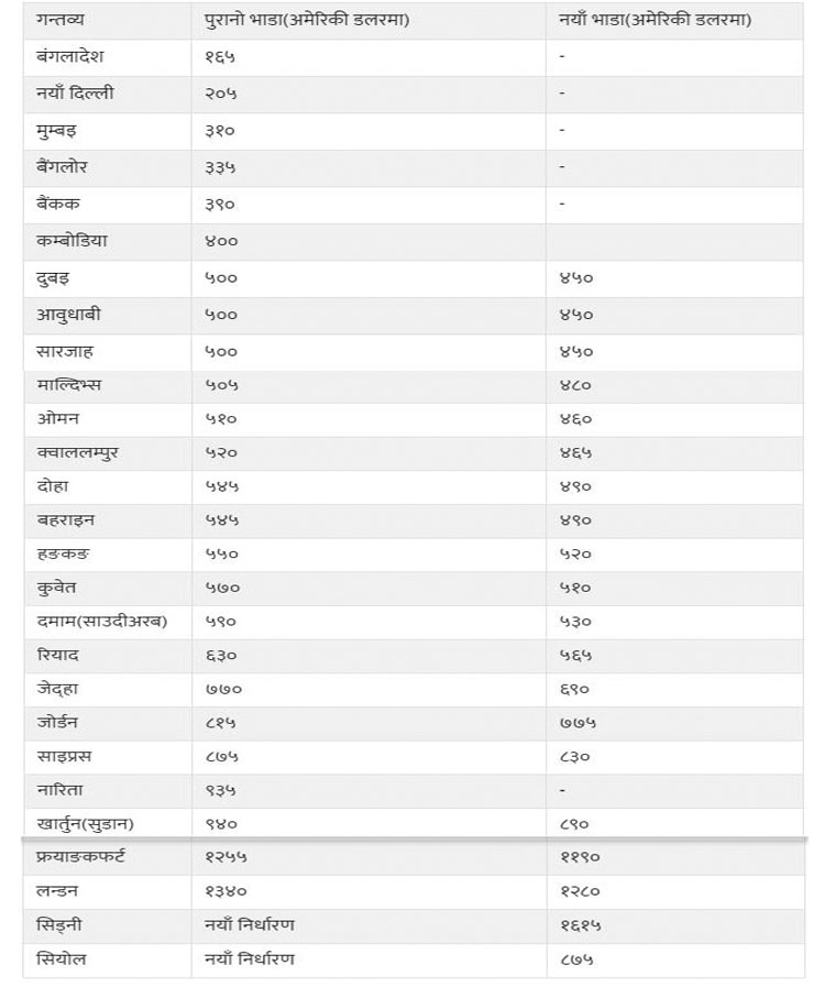 ओमानको भाडा ४६० बाट ३६८ मा झारिएको छ । बहराइनबाट फर्किने यात्रुले ३९२ डलरमा नेपाल एयरलाइन्सको टिकट पाउने छन् । यसअघि बहराइनबाट फर्किने भाडादर ४९० डलर तोकिएको थियो ।