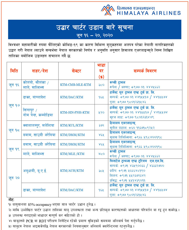 काठमाडौं । निजी क्षेत्रको वायुसेवा प्रदायक हिमालय एअरलाइन्सले विदेशमा अलपत्र परेका नेपालीको उद्धारका लागि गरिने चार्टर्ड उडानको नयाँ भाडादर र उडान तालिका सार्वजनिक गरेको छ ।