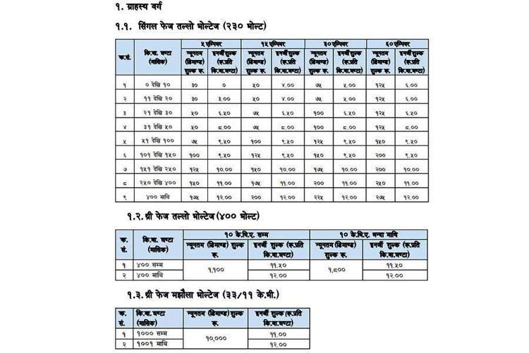 तथ्यांक अनुसार ५ एम्पियरको सिंगलफेज मिटर जोड्ने ग्राहकले ११ देखि २० युनिटसम्म खपत गर्दा डिमान्ड शुल्क ३० रुपैयाँ तिर्नुपर्ने छ । प्रतियुनिट शुल्क ३ रुपैयाँ कायम भएको छ ।